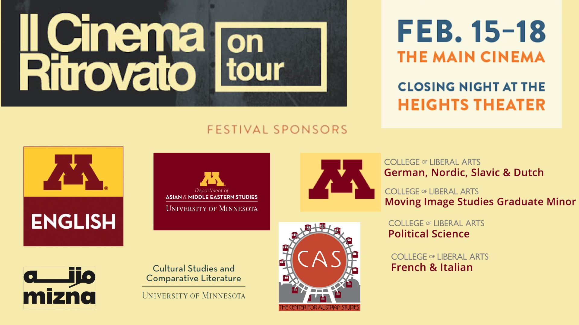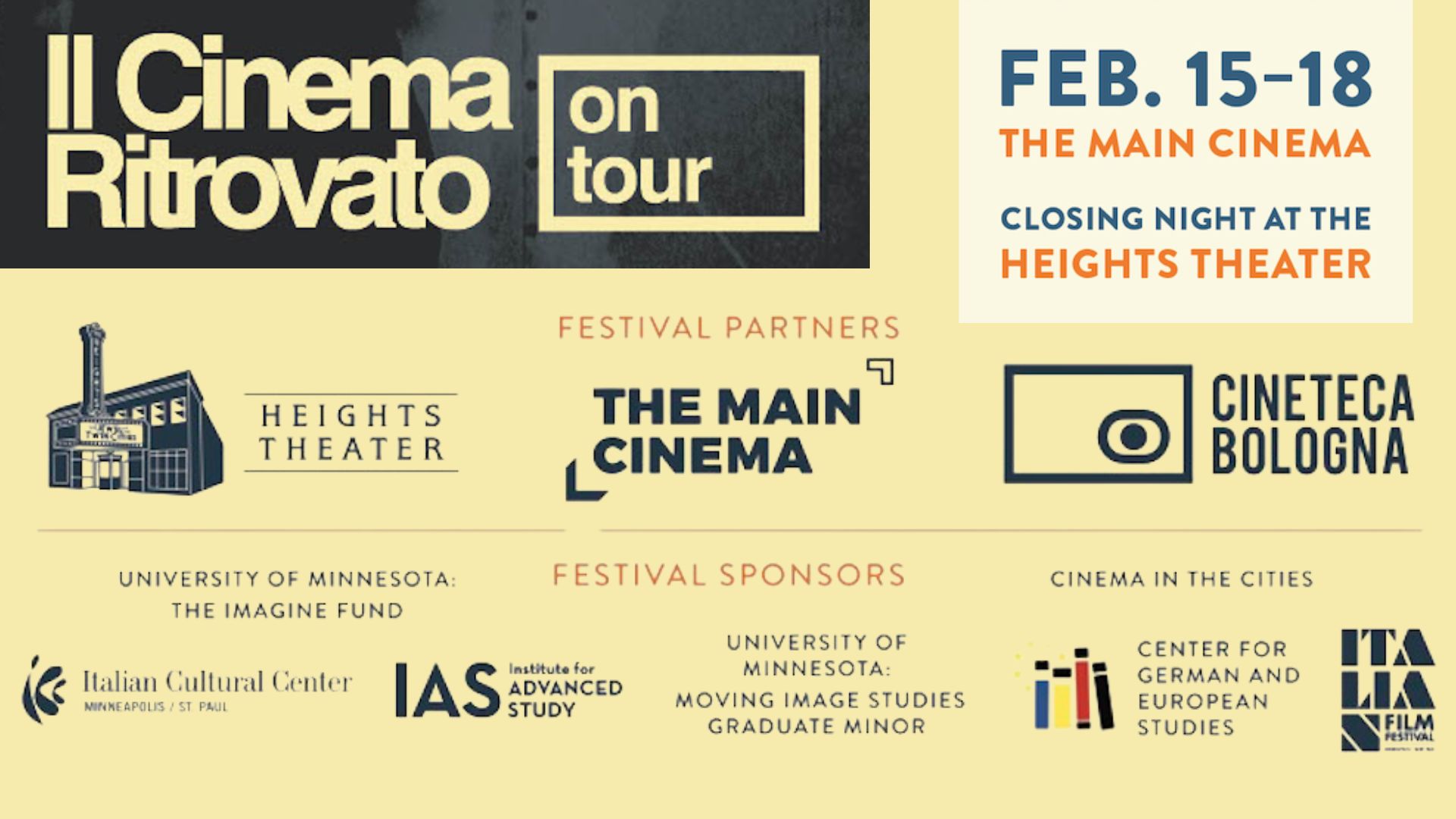 Our second edition of Il Cinema Ritrovato on Tour ran from February 15 to 18, 2024, at The Main Cinema in Minneapolis, MN, and The Heights Theater in Columbia Heights, MN. We proudly partnered for a second time with the Cineteca di Bologna, Il Cinema Ritrovato, and the Film Society of Minneapolis and St. Paul to present four days of restored, archival cinema from the 2023 edition of Il Cinema Ritrovato in Bologna, Italy.